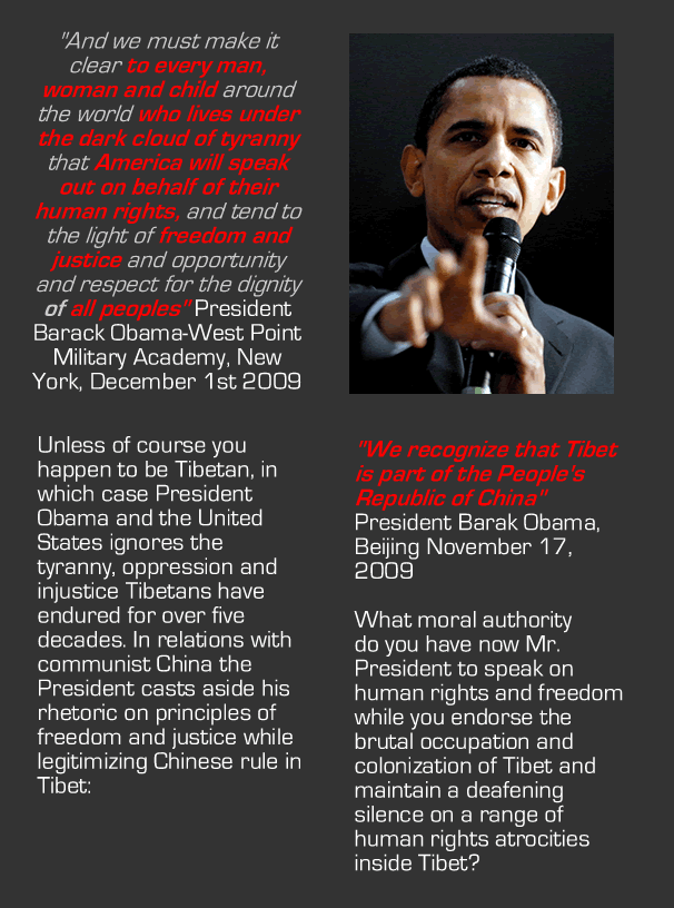 WELL SAID! The Obama Adminstration’s surrender to the Chinese Communist dictatorship sends a dangerous message to the party bosses in Beijing, that they can proceed with torture and murder in Tibet with no impediment, they will pay no price. Obama’s refusal to meet the Dalai Lama sends a message to other heads of state: throw Tibet overboard, do business with the genocial tyrants in China’s Politboro.