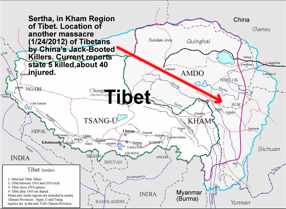 Update: Today (January 24) at Sertha in Kham Region of occupied Tibet many Tibetans in the town held a peaceful protest, shouting for human rights and Tibet’s freedom, when China’s paramilitary fired into the unarmed crowd. Reports from Voice of Tibet claim 5 have been killed, with around forty injured. One of the Tibetans murdered has been named as Baubeau, a 35 year old nomad.