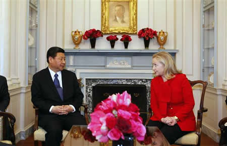 Whenever America’s banker flies into DC there’s a scramble to the wardrobes by the folks on the hill  to find a suitably complimentary color, a clear leader in this obsequious race is Hillary Clinton, whose eye for an outfit  never fails to impress. As China’s Vice President Xi Jinping  met with U.S. Secretary of State for a luncheon yesterday Hillary was resplendent in a eye-watering red jacket. Politics and low fashion collided in an effort to make China’s next President feel right at home, and what better way than to be dressed in the color so appreciated by the Chinese Communist Party. Officials at the State Department appear to have been busy getting up to speed with China’s favored decorations for such occasions, which usually involve masses of artificial or natural flowers in various combinations of red and yellow. This charming combination had clearly not escaped the attention of covert operations who dutifully briefed staff at the Department on which color scheme would send the right psycho-graphic message to Mr Jinping, which no doubt explains the various items and shades which dominate in the photograph above!