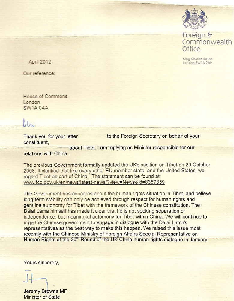 Thanks to our British friends and supporters we have received some revealing response from Members of Parliament and most recently a reply from the Minister with responsibility for China, Jeremy Browne MP, we have included it as an example of how supremely evasive and sensitive the Foreign Office (equivalent of the State Department) is on the subject of Tibet’s independence. Regarding the supposed ‘change of policy’ we have challenged the claim made by the British Foreign Office, details of which may be read HERE