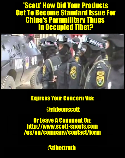 It’s hardly great PR for a progressive and ethics-based company to have its products used by a jack-booted military, which 24/7 is engaged in the oppression, torture and killing of Tibetans. Surely Scott was aware that its protective goggles would be seen as an endorsement of China’s brutal occupation of Tibet? But hey maybe we got this all wrong. So let’s give the company a chance, why not join in us in asking them to explain how their products got be be regular kit for China’s ‘security’ psychopaths. Is Scott doing business with China’s regime?