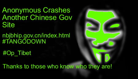 Reported today on Twitter that Anonymous has again targeted a Chinese government site as part of Operation Tibet, an action that opposes the censorship,oppression and human rights abuses of China’s regime and in support of Tibet’s true cause for independence. The site in question http://nbjbhip.gov.cn/index.html was at the time of this post offline. Many thanks to those individuals involved and appreciation to our friends on Twitter for alerting us to this latest action.