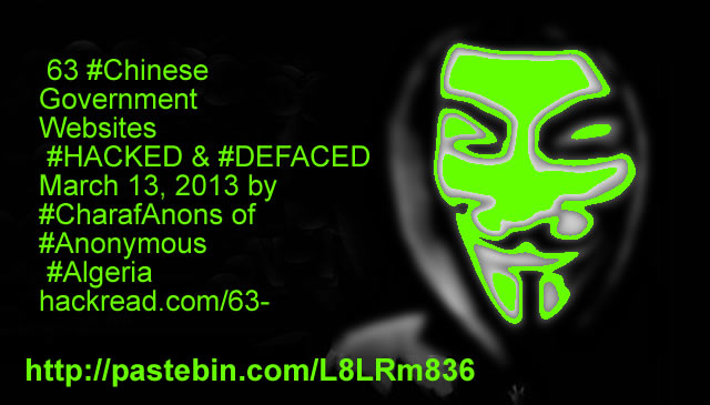 Hacktivist group known as Algerian Hacker announced late on March 13 that Charaf Anons had hacked and defaced sixty-three Chinese government websites. A list of those targeted may be found here: http://pastebin.com/L8LRm836