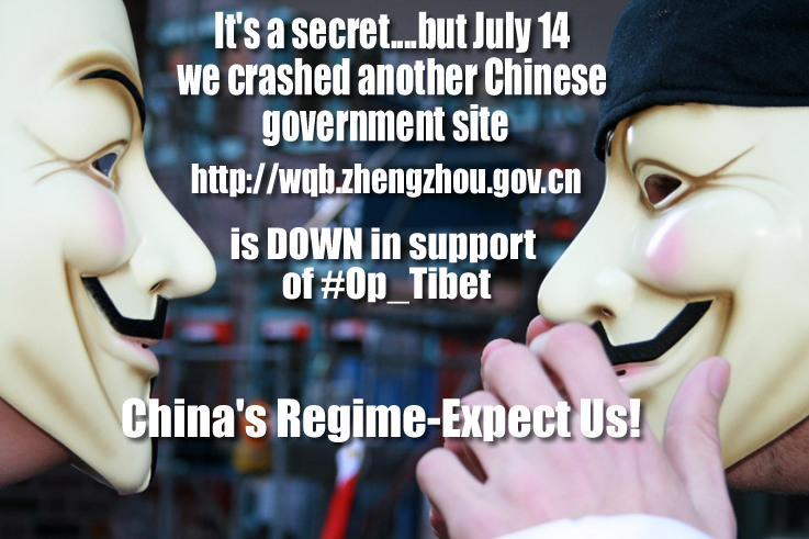 Breaking reports just posted on an anonymous hosting site that hacktivists have today crashed China’s propaganda website http://wqb.zhengzhou.gov.cn in support of Operation Tibet. No doubt China’s authorities will be scrambling to restore the website, but the damage has been done as again Anonymous has shown that it has the capacity and determination to disable official Chinese sites. Many thanks to our friends on Twitter for the heads-up on this latest action and to @anonriddler for sharing the image link.