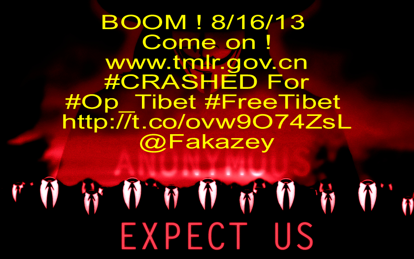 The Anonymous strike against Chinese government websites has crashed today another site, http://tmlr.gov.cn/ has been taken offline in support of ‘Operation Tibet’ in what has seen a number of official websites targeted over the past few hours. Many thanks to @Fakazey for news of this additional action and to @ProjectInject for sharing the graphic.