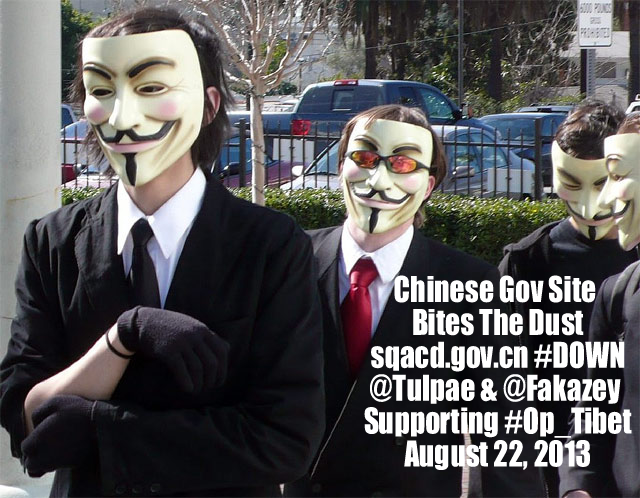 Anonymous hactivists are reporting on Twitter that today another Chinese government website has been targeted and disabled, the site http://www.sqacd.gov.cn/ is offline and has been struck as part of ‘Operation Tibet‘. Grateful appreciation to @Fakazey @Tulpae @AnonymousTibet and to @anonriddler for sharing the graphic image above.
