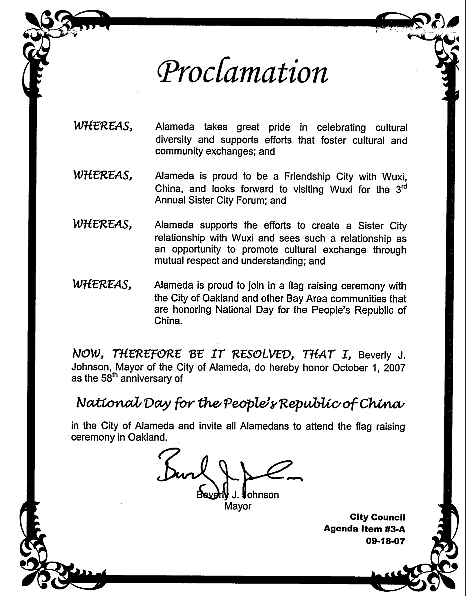 That decision is an endorsement of and compliance with a political event authorized and demanded each October 1st, in celebration of the founding of Communist China. Take a careful look at the wording as appearing in the Alameda City Council minutes of 08/21/07: