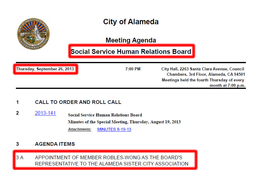 Thanks to the wonderful support and activism of our friends and subscribers, who took time out to contact the Mayor of Alameda in protest at the planned raising in that city of China’s flag on October 1 we were interested to note that yesterday a response was issued by  Alexander Nguyen the Assistant City Manager. In his email Alex was very clear in claiming that the event was “not a formal City Hall event” and that it was “sponsored by our local Sister City Association….,”. So no connection then with the city authorities? Well the same day this claim was made, at 7.pm during a meeting of Alemada’s Social Service Human Relations Board, a Mr Robles Wong was appointed as a representative of City Hall to guess which body? You got it the Sister City Association! The very organization which Mr Nguyen was at pains to assert was sponsoring the ‘private’ flag raising event. Hmmm!