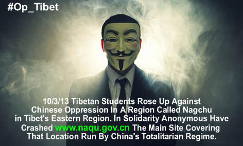 A vicious martial law has been imposed, the area effectively a prison with a prison and all because Tibetans declined to honor the Chinese flag and respect the so-called Motherland, an action Mayor Gilmore of Alameda was seemingly all too happy to endorse. Meanwhile we understand from our friends over on Twitter that Anonymous have today launched an action against another Chinese government website, the hacktivists have disabled the Chinese regime’s Nagchu website. As this post was written www.naqu.gov.cn was offline. Many thanks to @anonyzmeduza for the heads-up on this.