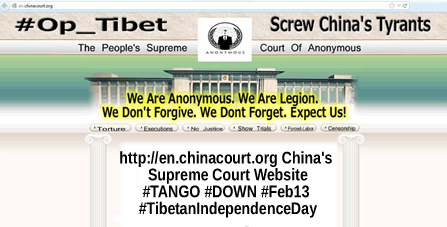 Imagine the applause then which erupted over the past few hours as Anonymous targeted a number of websites run by China’s regime, some operating in occupied Tibet, and left a trail of wreckage, defacement and hacked sites, including that of the Supreme Court of China, which was taken offline by hacktivists earlier this morning. Others have been trashed, including a site linked to East Turkestan, the content of which has been removed and replaced with unreadable characters. While two sites that cover regions in Eastern Tibet have been completely crashed!