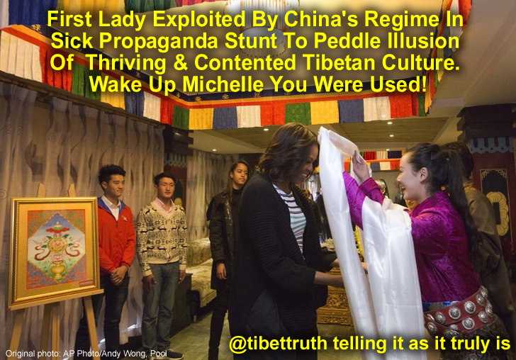 1. Your analysis is too simplistic. Michelle Obama requested to eat at a Tibetan restaurant. Of course she knew she would get presented with a certain facade. But it’s good that she ate at a Tibetan restaurant and met real Tibetans, and I am sure they appreciated her presence, despite having to act out the facade. Read between the lines here. The Tibetan staff know that MO made this request, very soon after her husband met His Holiness the Dalai Lama. The staff, MO and the Chinese government are all aware of self-immolations. Nobody is under any illusions. She was not used. But in a subtle way, she made a point. While in the PRC, she also spoke about the importance of the Tibetan language.