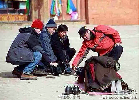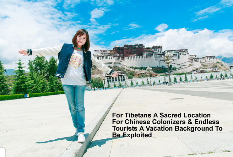 This disturbing image encapsulates the plight of Tibetans as a colonized people, it also reflects how Chinese people have been indoctrinated into seeing the people of Tibet and its Buddhist culture as an exotic and exploitable curiosity. Tourism to occupied Tibet is a fundamental and prized economic component of China’s strategy that seeks to assimilate, marginalize and eventually eradicate Tibetan national identity. There exists too an inherent racism that regards Tibet’s people as ‘inferior’, its culture strange and backward, little wonder then that these Chinese tourists show a contemptible disregard for this Tibetan prostrating here in respect of and devotion to Buddha.