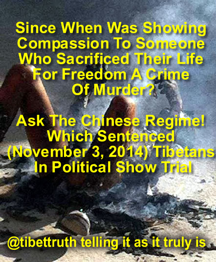 In another political show trial China’s regime has revealed its contempt for genuine justice and charged November 3 a number of Tibetans in Ngaba region of Amdo, eastern Tibet with murder. It would appear that displaying compassion and support to anyone who sacrifices themselves for the freedom of Tibet is regarded as a criminal act! Details of the case have been released by the exiled Tibetan organization Gu Chu Sum and may be read on may be read on Dossier Tibet’s site