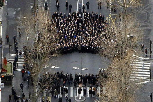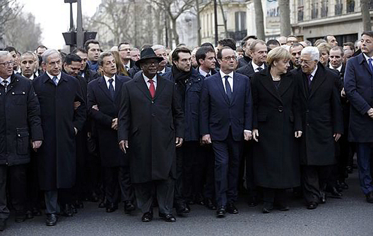 The cynical sleight-of-hand, aided by a servile and at times hysterical media support was rightly exposed and criticized across the Internet, yet that outrage was eclipsed by the venom and condemnation at the presence of Israeli leader Benjamin Nentanyau, ‘The Butcher Of Gaza’ who has the blood of countless innocent Palestinians upon his hands. What had been born from the hopes and solidarity of French citizens was kidnapped and debased into a circus of propaganda. Those who had rained terror from the skies onto civilians in Palestine, Afghanistan and Iraq now donned the color of mourning and issued platitudes of deceit about freedom-of-speech, human rights and democracy! The terrorist elite lifted aloft the birds of peace and justice and vowed to honor and defend freedom, it was a demonstration of delusion and deception on a scale reminiscent of 9/11.