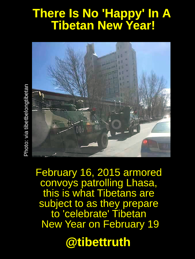 Across the lands of occupied Tibet, which since 1950 has become effectively the world’s largest prison, with some 6 million Tibetans held captive by China’s terrorist regime, numbers of paramilitary troops are increased. Reports describe additional units of armed police, while armored convoys are on the streets of Lhasa, the Tibetan capital. A merciless war of oppression is again being waged against Tibetans and their culture as the people of Tibet prepare as best they can to mark the coming Tibetan New Year.