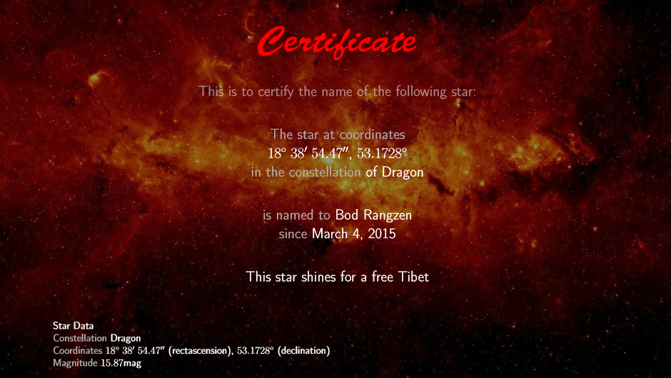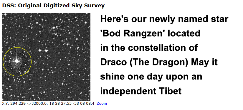 We are very happy to report that today we have named and registered a star within the constellation of Draco as ‘Bod Rangzen’ (independence for Tibet). While NASA is probably unwilling to recognize this registration, due in large part to not wishing to upset its Chinese space partners , it’s title will be accepted by all those who value freedom, justice and human rights.