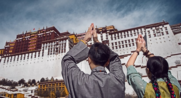 The photographs invite us to celebrate and be happy for these young romantics who one minute are dressed in Armani the next wearing traditional Tibetan clothes. A modern Tibet in which cultural values are respected, so much so that we see them at the foot of Lhasa’s Potala Palace, hands raised in veneration, but of what exactly? Eagle-eyed subscribers may notice at the top of that former home of the Dalai Lama flies the flag of communist China and we suspect that it is to China’s regime that these actors offer their praise.