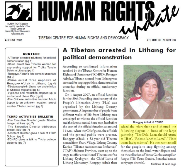 “When on stage Runggye Adak boldly grabbed the microphone and addressed a crowd of several thousand Tibetans who had gathered for the annual festival. He said: “If we cannot invite the Dalai Lama home, we will not have freedom of religion and happiness in Tibet.” adding that “Eye-witnesses also say that Runggye Adak’s speech called for local Tibetans to stop fighting among themselves about land and water issues..” Source