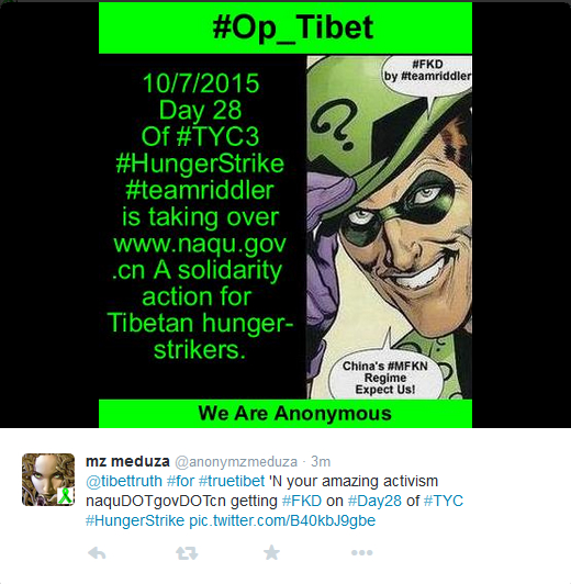 Secondly, we just received a tweet from @anonymzmeduza reporting that a Chinese regime website has today been attacked by the hacktivist collective known as #teamriddler. The official site, which seems to cover the Nagchu area of Tibet’s Kham region has been been targeted.