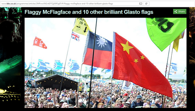 According to our friends @Glasto4TIBET who are 24/7 monitoring live streams it looks like BBC camera ops @ Glastonbury festival have been given instructions to use tight shots of the crowd, interspersed with rapid cuts. This has the result of minimum exposure of flags being shown, especially from stage view into the crowd, those shots which do feature flags are mostly distance views or very quick snaps before cutting. Interesting. Could be fertile imaginings but after last year and especially the presence at the festival of the Dalai Lama, with the masses of Tibetan flags we got raised, it maybe a certain pressure was put upon the British Foreign Office. Which in turn requested support from its Establishment colleagues at the BBC to avoid any exposure of the Tibetan flag. Is it really just coincidence that on the BBC Glastonbury website there’s a short report on flags at the festival with the main photo showing…the flag of China’s regime?!