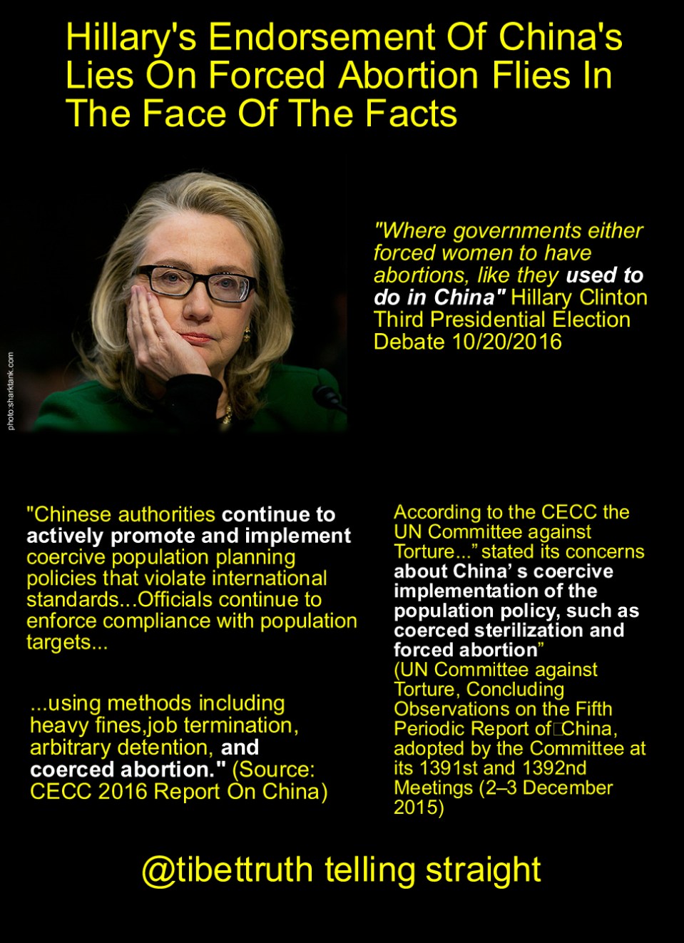 Within the somewhat more restrained posture and rhetoric displayed by both Clinton and Trump during the final Presidential Election Debate Hillary came out with a line that would have passed by unnoticed to those sucked in by the inflamed narrative which has characterized this contest. The former Secretary of State used this national televised platform to declare her belief that forced abortions in China are now ended. In other words she has issued a public endorsement of China’s propaganda assertions on this issue. Yet her declaration is at odds with a wealth of documented evidence and reports. And she now finds herself contradicting, on the subject, the meticulous conclusions and inquiries of the Congressional Executive Committee On China and the United Nations Committee Against Torture! No doubt her fact-free assertion would have been warmly received by the Chinese Regime, not so those women across China and occupied lands such as Tibet and East Turkestan who continue to suffer a range of violations under China’s draconian population control policies. Including forced sterilizations and forced abortions.