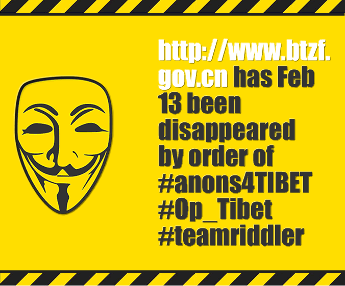 The operation you carried out not only disabled a number of official sites, causing disruption and delay to the Chinese authorities, but more importantly sent a resounding message. Namely, that people around the world care about the plight of Tibetans and are willing to expose and oppose the dark realities of Chinese rule in Tibet. In addition, thanks to your actions the issue was given wide exposure across the digital maelstrom of social media.We were greatly assisted in receiving news about events by the following, who deserve special mention: @AnonymousTibet @team_riddler @anonymzmeduza @BodhiAnon @anonriddler @ProjectInject