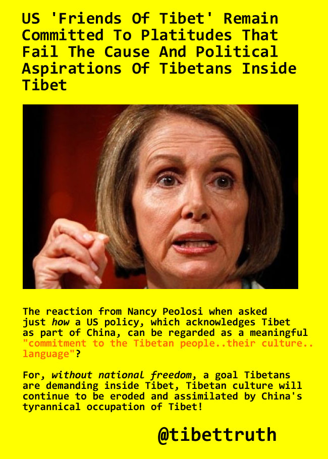 They will be accorded considerable praise and gratitude as friends of Tibet, yet in truth their support is constrained to issues of human rights and culture, while this may be regarded as positive assistance it fails to address the just and historic right of Tibet’s people to national independence. The reason why Ms Pelosi and her Congressional colleagues are silent on that core subject is, that while appearing to be champions of the Tibetan cause, they are advocates of the US policy which recognizes Tibet as an integral part of China. This explains their carefully worded emphasis on cultural issues and human rights, to avoid any mention of Tibet’s status or reference to the struggle being waged inside Tibet.