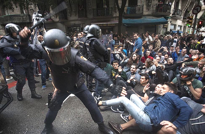 The sight of body-armoured thugs raising batons against peaceful protest has become a depressingly familiar scene, events in Catalonia a vicious replay of the state suppressing the democratic will of a people. In the case of the Catalans, a just and rightful desire for national freedom is being forcefully denied by an authority which, in its endorsement of police brutality, is reminding the world of the dark days of facism in Spain.