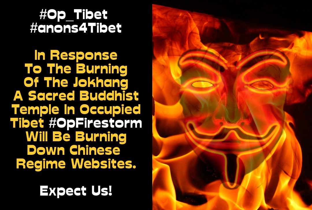 There have been other Buddhist sites burned down across Tibet, which were attributed to ageing Tibetan architecture, electrical faults or unguarded fires in kitchens. Such claims. coming from the mouth of a regime which is actively repressing the practice Buddhism in Tibet are problematic and remain unable to convince. Which explains why in the wake of yesterday’s inferno social media was buzzing with images and questions on the Jokhang fire. Meanwhile today Anonymous activists have been posting across Twitter of their intent to target Chinese government websites, an action which they presumably is justified, not only on the possibility that China’s regime may have been responsible for the blaze, but also as a response to the ongoing tyranny against Tibetans and their culture.