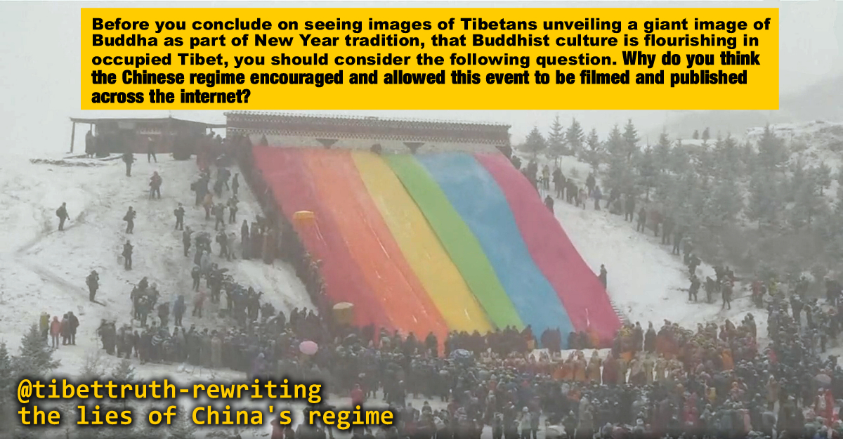 With China’s regime 24/7 pumping out disinformation on Tibet a lot of folks across social-media are exposed. For those with little knowledge of the situation in occupied Tibet it’s easy to be convinced. Take the report from a couple days back (eargerly consumed and spread by a consistently servile and uncritical mainstream media) that Tibetans were braving blizzard conditions to perform a New Year unveiling of a giant Buddha. Anyone reading that story or viewing the video footage would be forgiven for having the impression that Buddhism is alive and well within Tibet, after all seeing is believing. Right? However if there’s one truth which defines China’s portrayal of its rule over the Tibetan people and their culture, is that nothing is ever as it seems! A sleight-of-hand which our team over on @tibettruth expose in the image above, when they rightly ask people to think on the reasons why the Chinese regime approved that event. What a pity that news agencies do not apply such critical examination to the torrent of lies which reach their desks from China’s Ministry Of Deception!