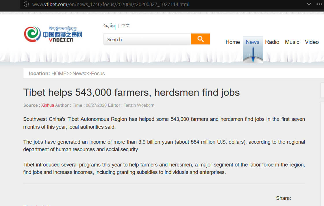 The Chinese regime declared August 24 2020 that during the year “Tibet helps 543,000 farmers, herdsmen find jobs”. See print-screen below